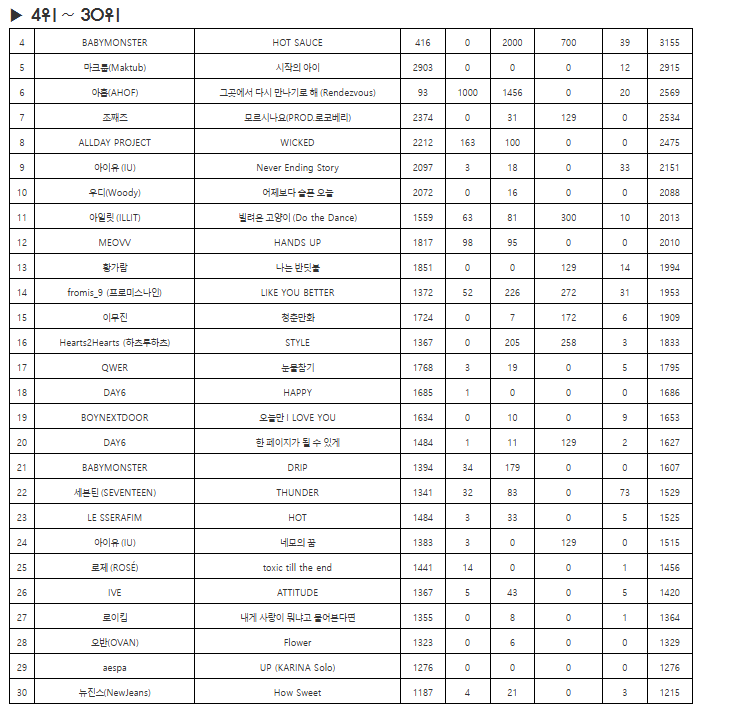 한편 이날 방송에는 나우즈, 누에라, Baby DONT Cry, BABYMONSTER, SUPER JUNIOR, 아일릿, 아홉(AHOF), aespa, 엔싸인, ALLDAY PROJECT, 1MILLION, 원어스, 전소미, CLOSE YOUR EYES, 트와이스, 파우, 하이키, 한승우, 힛지스 등이 출연해 다채로운 무대를 꾸몄습니다.