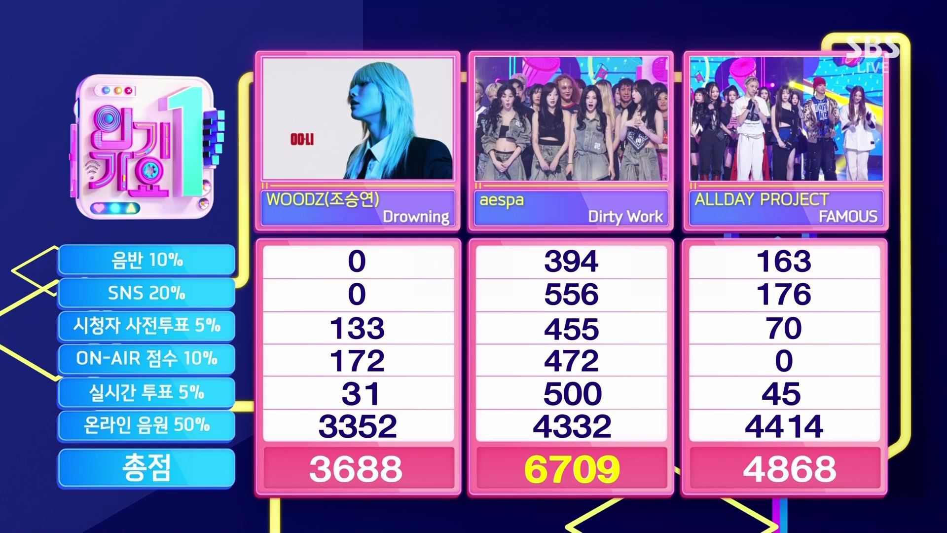 이날 SBS 가요프로그램 ‘인기가요’에서는 우즈(조승연)의 ‘드라우닝’(Drowning), 에스파 ‘더티 워크’, 올데이 프로젝트의 ‘페이머스’(Famous)가 1위를 놓고 경쟁했는데요~~~