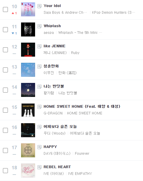 위의 차트는 지니뮤직 7월 16일 자 일간차트이고