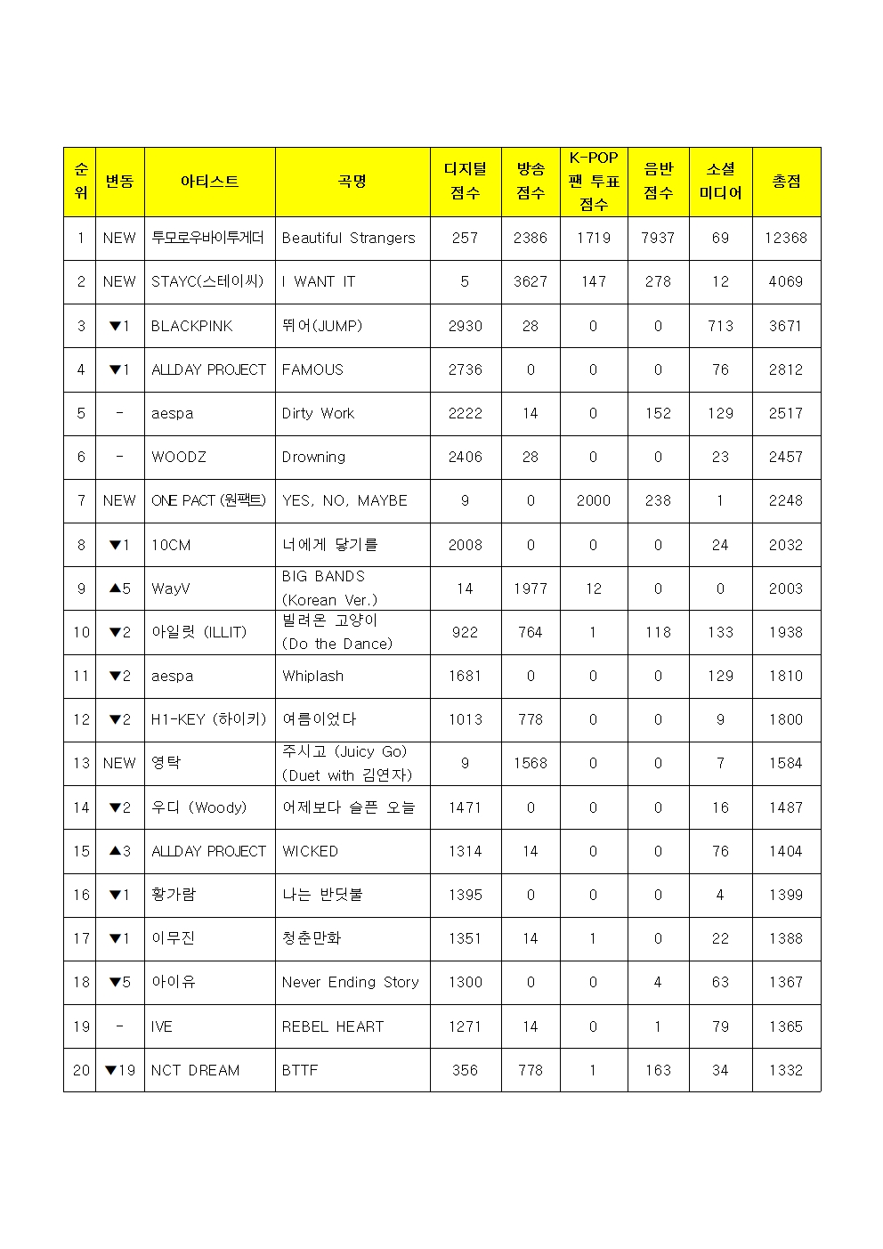 집계 결과 투모로우바이투게더의 '뷰티풀 스트레인저스(Beautiful Strangers)'가 디지털 음원 점수 257점, 방송 횟수 2386점, K팝 팬 투표 1719점, 음반 7937점, 소셜 미디어 69점 총 12368점으로 1위에 올랐습니다.