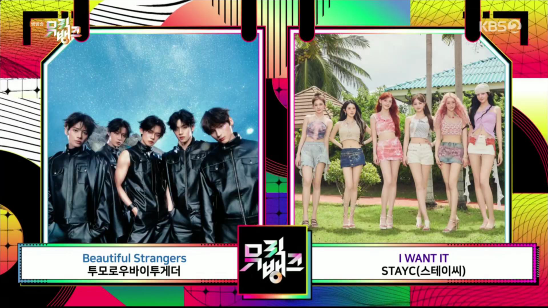 1일 방송된 KBS2 '뮤직뱅크'에는 투모로우바이투게더의 '뷰티풀 스트레인저스(Beautiful Strangers)'와 스테이씨의 '아이 원 잇(I WANT IT)'이 1위 후보에 올랐는데요~~~