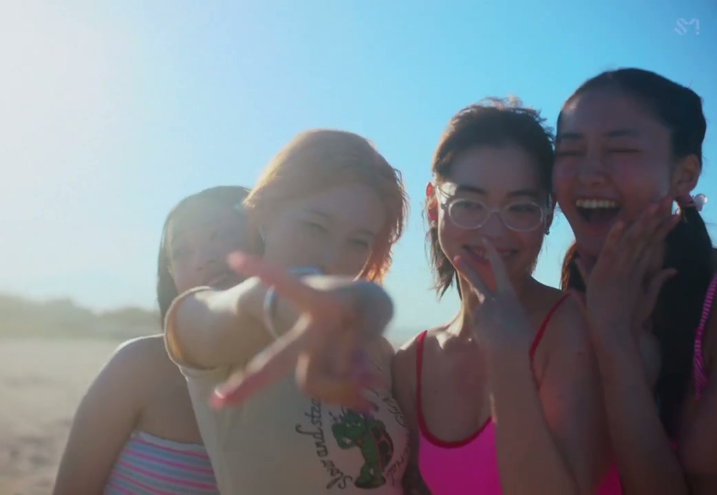 영상속 조이는 친구들과 함께 눈부신 여름 해변가로 떠난 여행에서,
