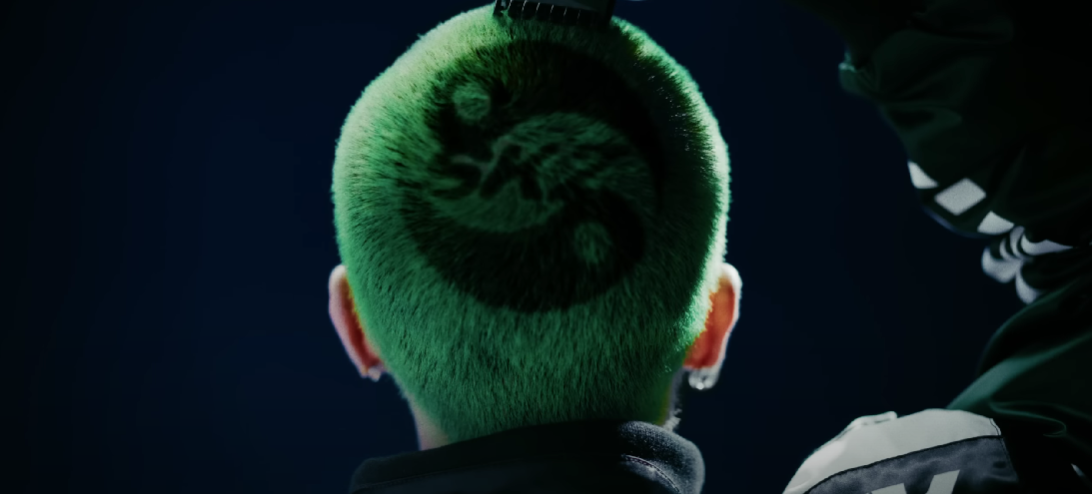 시작부터 스트레이 키즈 음양 로고를 스크래치 형태로 새긴 현진의 헤어스타일이 시선을 집중시키며