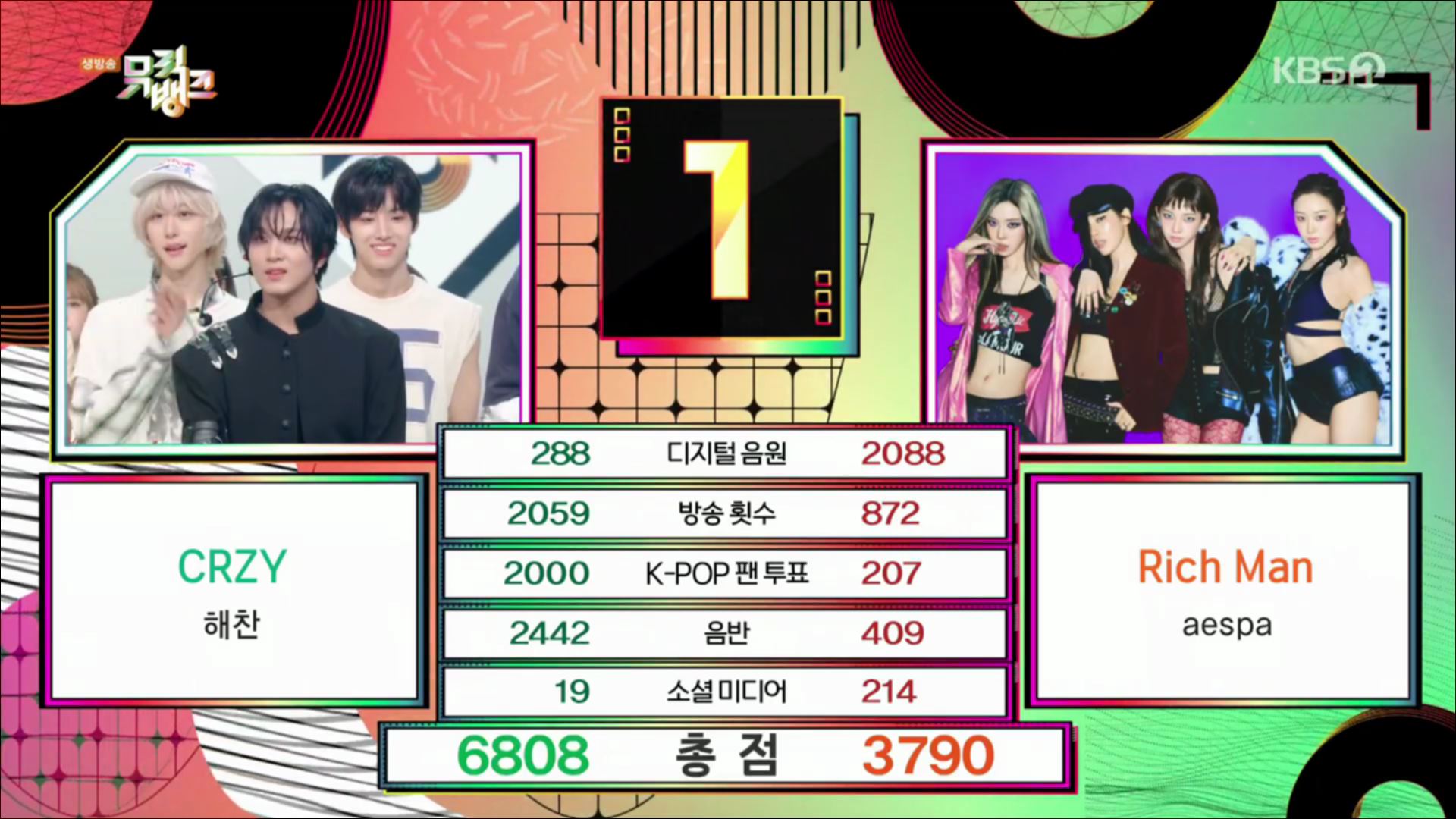 이날 '뮤직뱅크' 1위 후보에는 해찬 '크레이지'(CRZY)와 에스파 '리치맨'(Rich Man)이 올랐는데요~~~