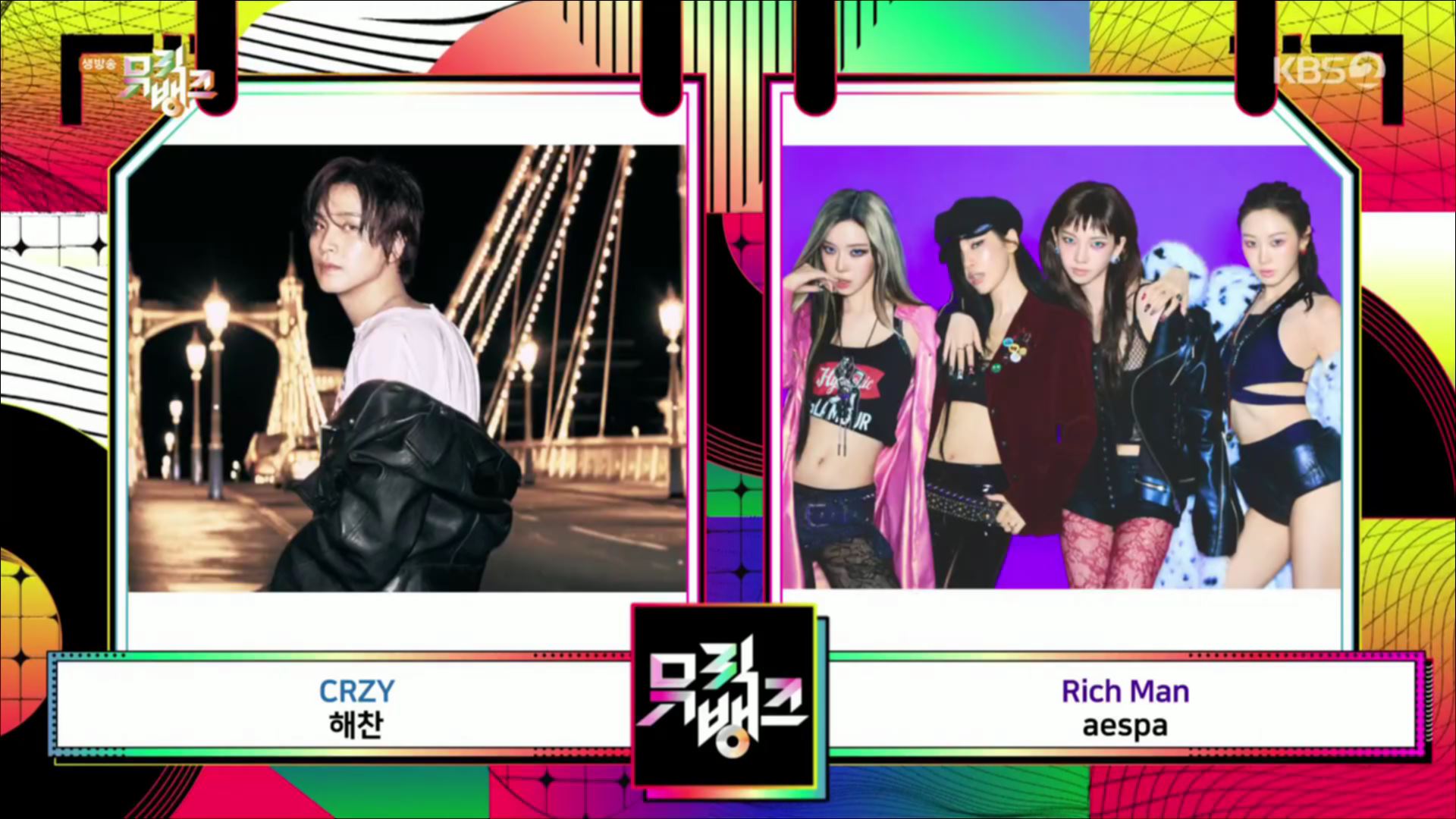 뮤직뱅크' 1위 후보에는 해찬 '크레이지'(CRZY)와 에스파 '리치맨'(Rich Man)이 올랐으며...............