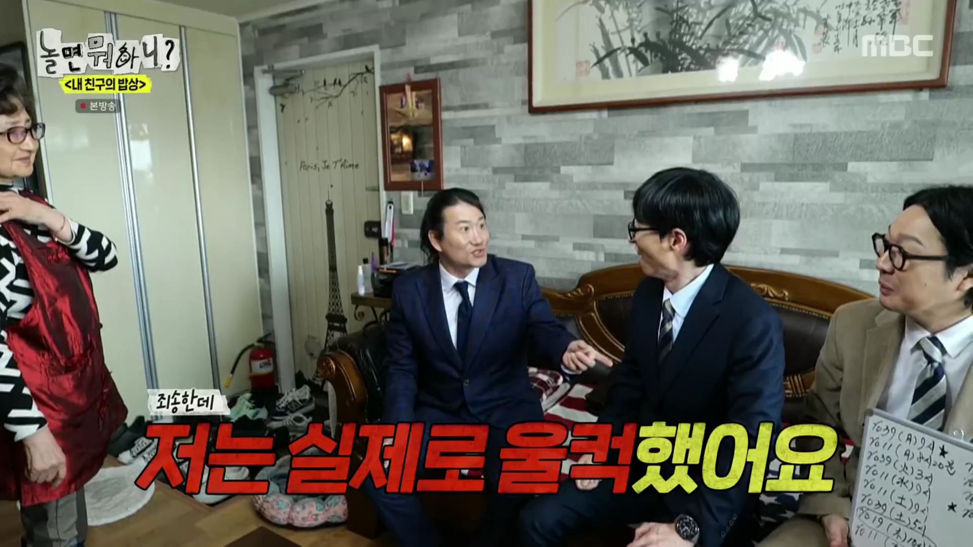 이에 유재석은 감동을 받은 듯 임우일의 모친에게 "어머니! 우일이 나오는 방송 적어 놓으신 거예요?"라고 묻자