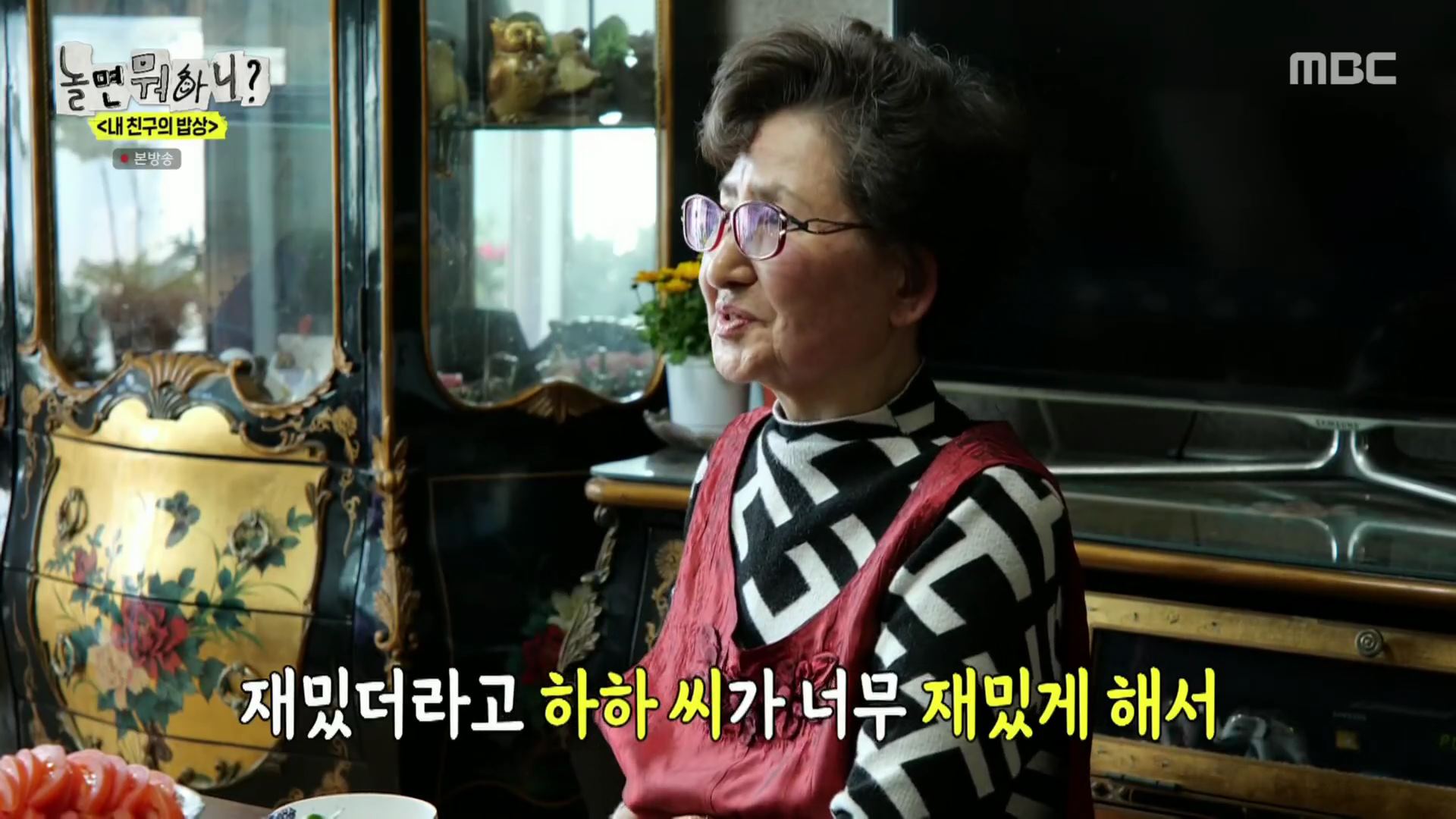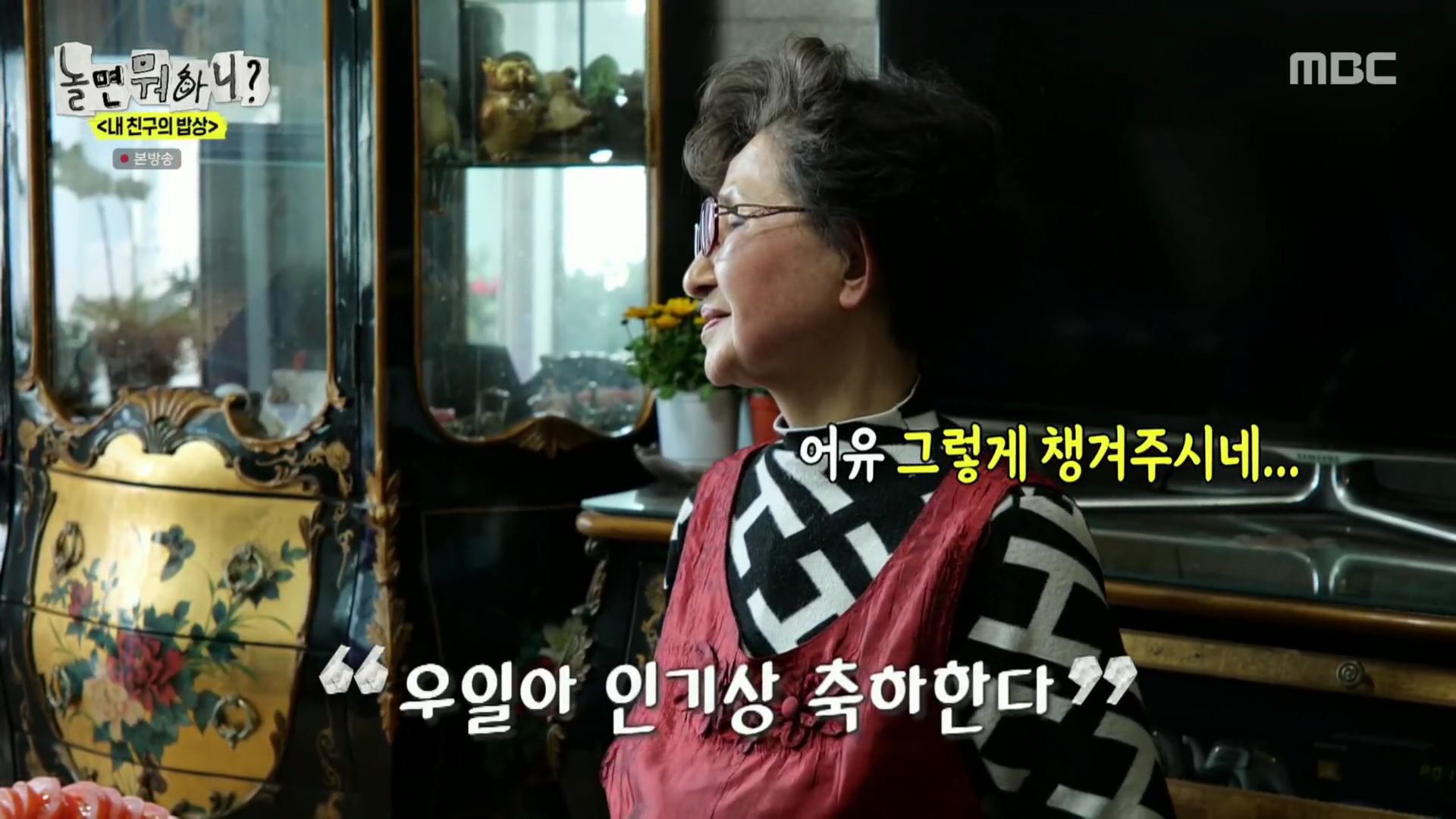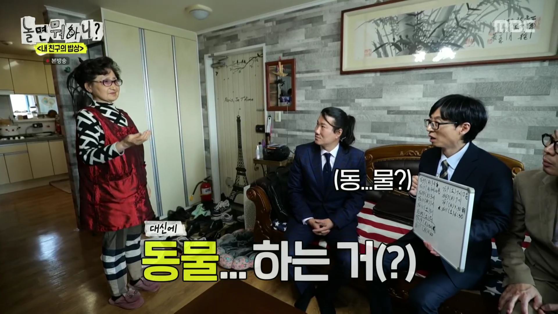 예상과 달리 임우일의 모친은 "제가 연속극을 안 봐서 동물 나오는 프로그램, '안싸우면 다행이야' 그런 것 재방송을 보려고 적어놨다"라고 답해 현장을 웃음바다로 만들었습니다.