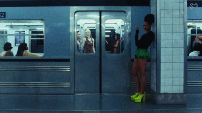 지하철을 배경으로...... 레더 재킷 속 화려한 원피스를 입은 그녀가 넘치는 자신감을 보여주었는데요~~~